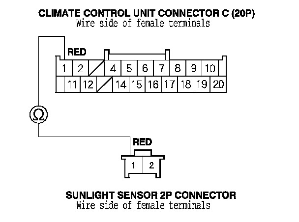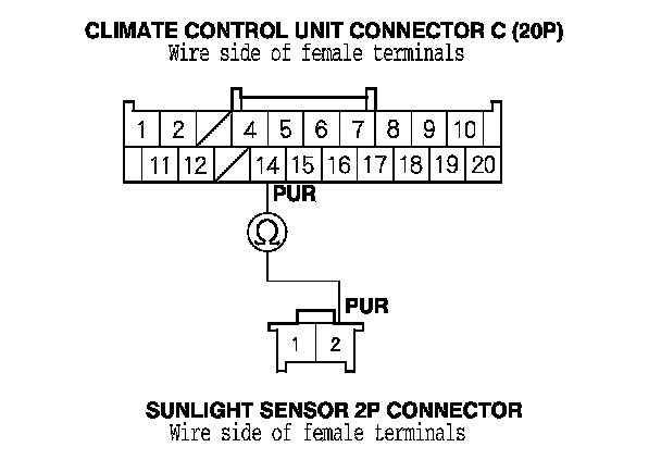 8. Check for continuity between climate control unit connector C (20P) terminal No. 14 and sunlight sensor 2P connector terminal No. 2.