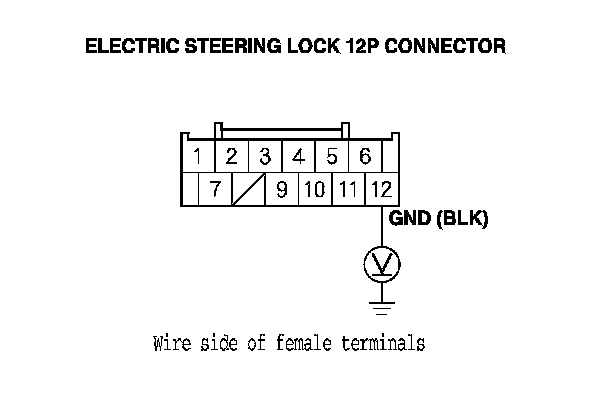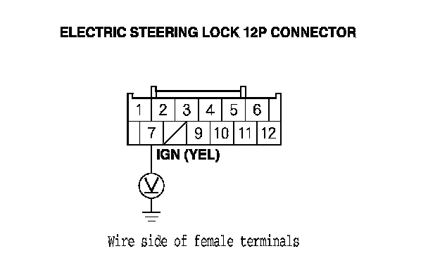 7. Measure the voltage between body ground and electric steering lock 12P connector terminal No. 12.