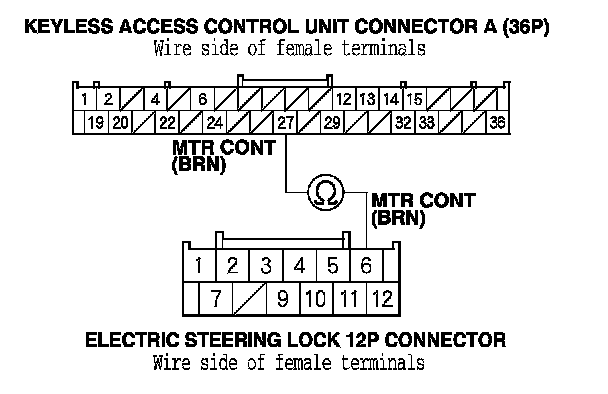 14. Check for continuity between electric steering lock 12P connector terminal No. 6 and keyless access control unit connector A (36P) terminal No. 27.