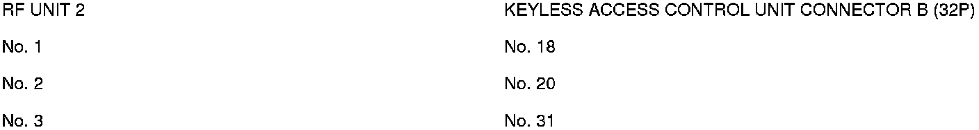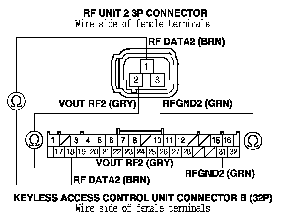 8. Check for continuity between the following RF unit 2 3P connector terminals and keyless access control unit connector B (32P) terminals.