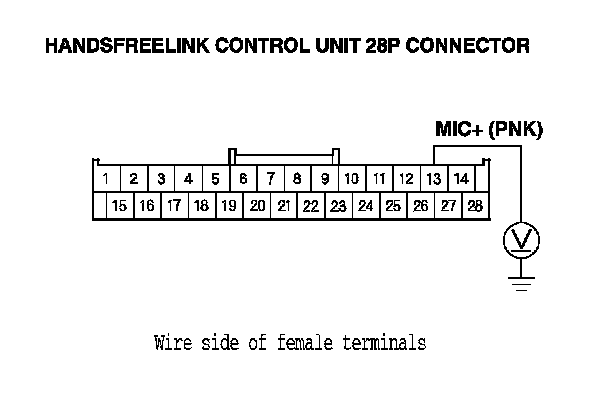 10. Measure the voltage between HandsFreeLink control unit 28P connector terminal No. 13 and body ground.