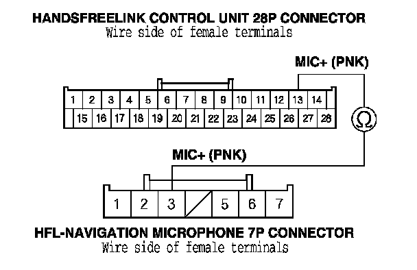 12. Check for continuity between HandsFreeLink control unit 28P connector terminal No. 13 and HFL-navigation microphone 7P connector terminal No. 3.