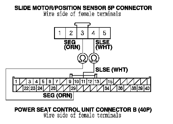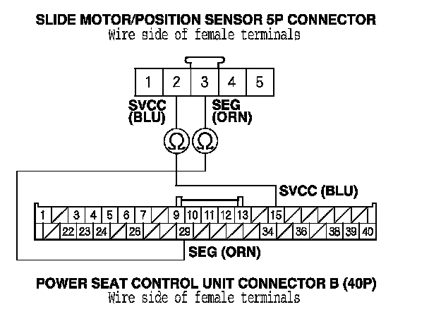 20. Check for continuity between power seat control unit connector B (40P) terminals No. 15 and No. 29 and slide motor/position sensor 5P connector terminals No. 2 and No. 3 respectively.