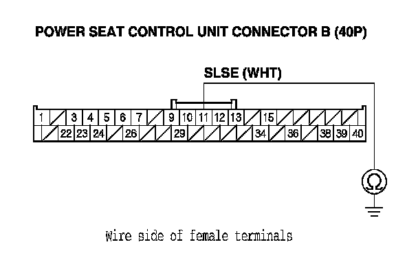 13. Check for continuity between body ground and power seat control unit connector B (40P) terminal No. 11.