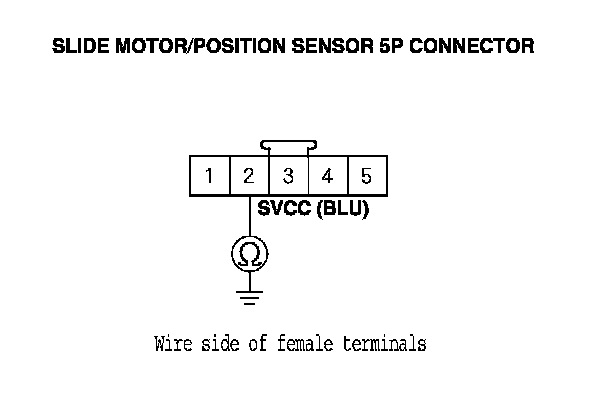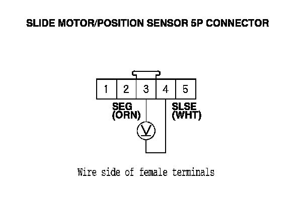 16. Measure the voltage between slide motor/position sensor 5P connector terminals No. 4 (+) and No. 3 (-).