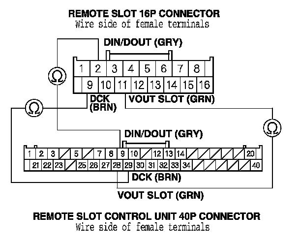 11. Check for continuity between remote slot control unit 40P connector terminals No. 9, No. 29, and No. 28, and remote slot 16P connector terminals No. 2, No. 9, and No. 11 individually.
