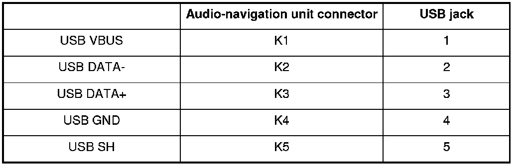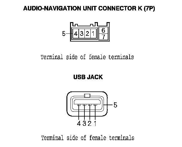 16. Check for continuity between audio-navigation unit connector K (7P) and the USB jack according to the table.