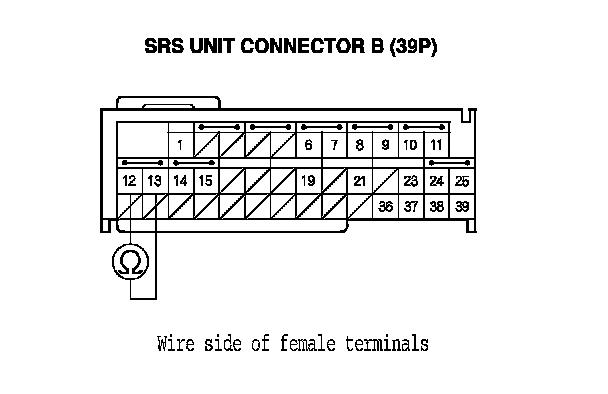 14. Measure the resistance between SRS unit connector B (39P) terminals No. 12 and No. 13. There should be 2.0-3.0 Ohms.