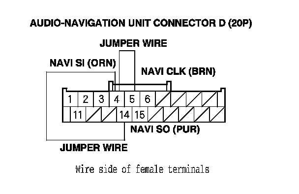 6. Connect audio-navigation unit connector D (20P) terminals No. 4, No. 5, and No. 14 with a jumper wire.