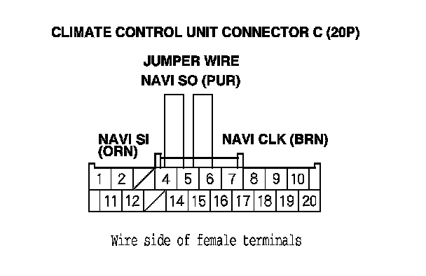 11. Connect climate control unit connector C (20P) terminals No. 4, No. 5, and No. 6 with a jumper wire.