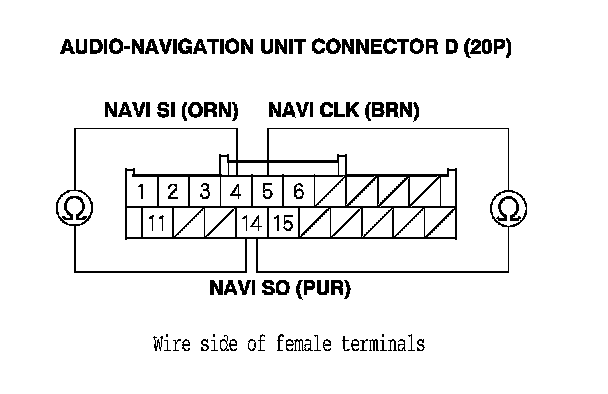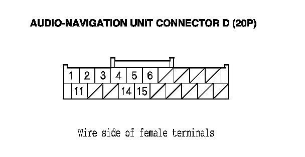 15. Check for continuity between the terminals of navigation unit connector D (20P) according to the table.