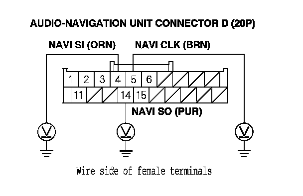 17. Measure the voltage between body ground and audio-navigation unit connector D (20P) terminals No. 4, No. 5, and No. 14 individually.