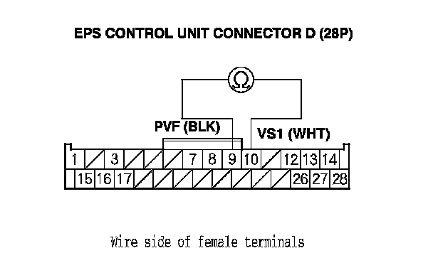 10. Check for continuity between EPS control unit connector D (28P) terminal No. 9 and body ground.