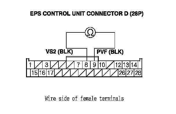 9. Measure the resistance between EPS control unit connector D (28P) terminals No. 8 and No. 9.