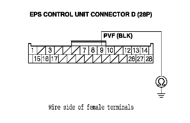 12. Check for continuity between EPS control unit connector D (28P) terminal No. 9 and body ground.