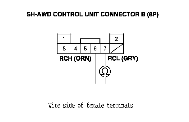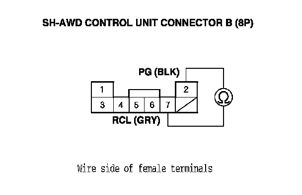 15. Check for continuity between SH-AWD control unit connector terminals B2 and B7.