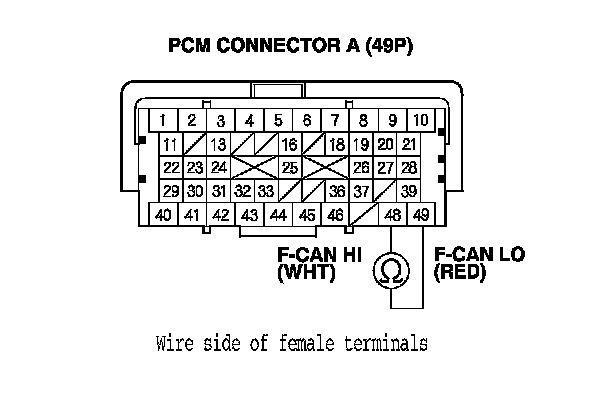 11. Measure the resistance between PCM connector A (49P) terminals No. 48 and No. 49. There should be less than 1.0 Ohms.