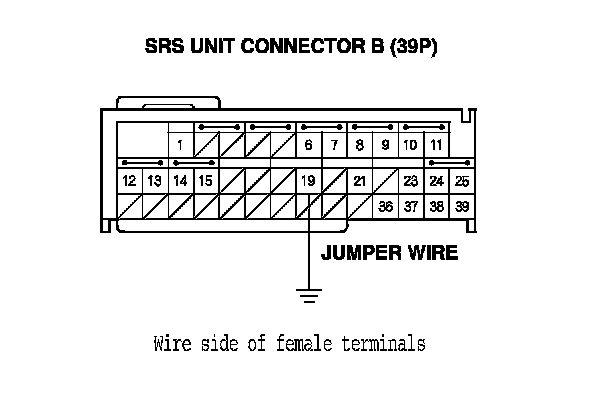 6. Install a jumper wire between SRS unit connector B (39P) terminal No. 19 and body ground.