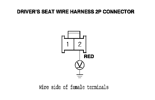 13. Measure the voltage between driver's seat wire harness 2P connector terminal No. 2 and body ground. There should be more than 10 V.