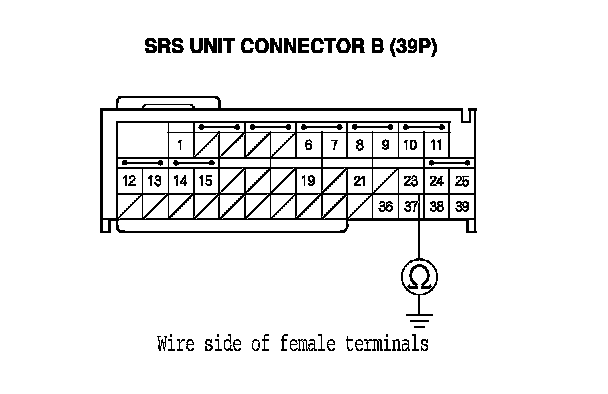 15. Measure the resistance between SRS unit connector B (39P) terminal No. 23 and body ground. There should be an open circuit or at least 1 MOhms.