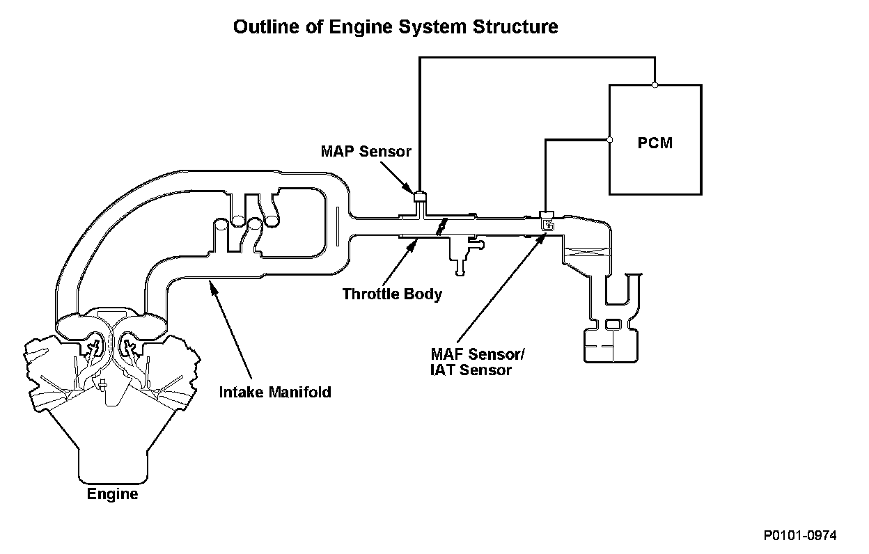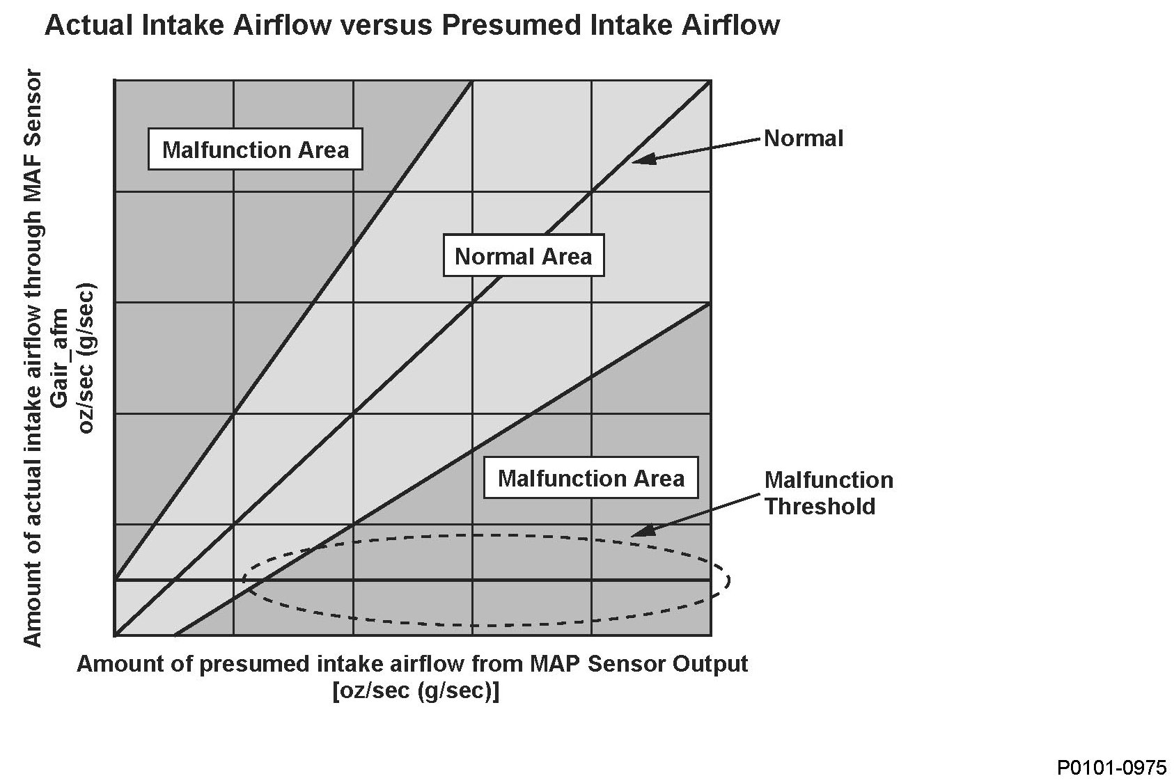 The mass airflow (MAF) sensor directly measures the amount of intake airflow into the engine, and the powertrain control module (PCM) controls the fuel injection based on the measured value. The manifold absolute pressure (MAP) sensor measures the intake manifold pressure, and the PCM calculates the amount of intake airflow from the MAP sensor output and the engine revolutions. The PCM compares the MAF sensor output (amount of intake airflow) and the amount of intake airflow calculated from MAP sensor output. If their difference is too large (in the malfunction area), the PCM detects a malfunction and a DTC is stored.