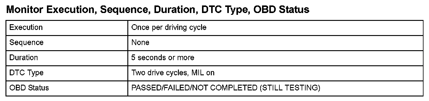 Monitor Execution, Sequence, Duration, DTC Type, OBD Status