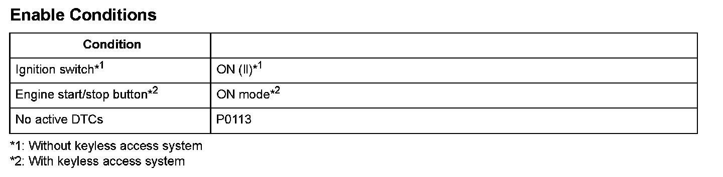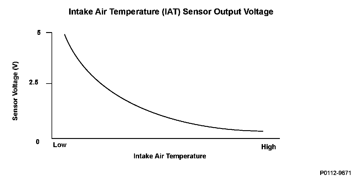 The intake air temperature (IAT) sensor is a thermistor that detects intake air temperature, and it is used for A/F feedback control to compensate for the atmospheric density fluctuations that accompany changes in intake air temperature. The IAT sensor resistance varies depending on temperature. The output voltage and the sensor resistance increase as the intake air temperature decreases. Conversely, the output voltage and the sensor resistance decrease as the intake air temperature increases. If the IAT sensor output voltage is excessively low, the powertrain control module (PCM) detects a malfunction and a DTC is stored.
