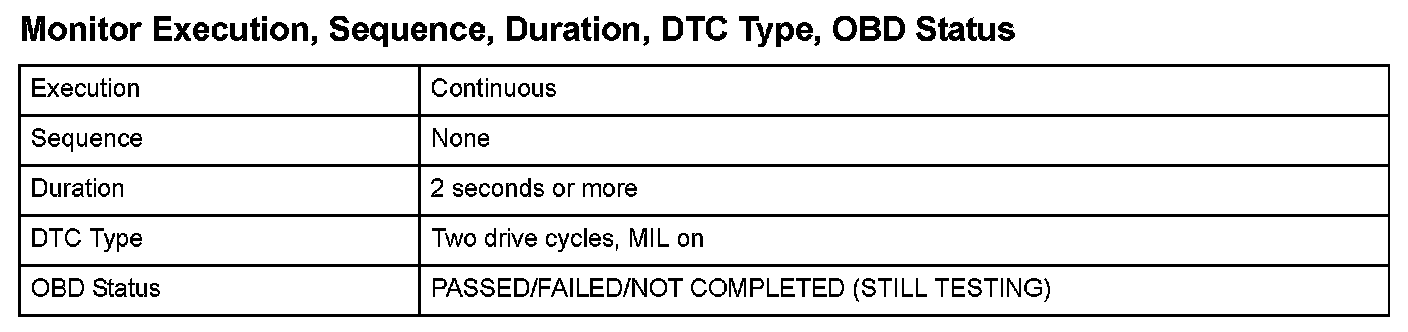 Monitor Execution, Sequence, Duration, DTC Type, OBD Status