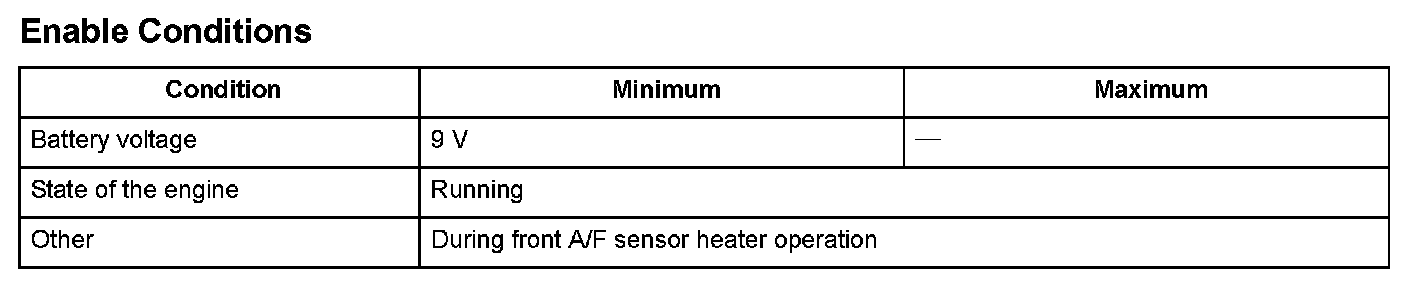 A heater for the sensor element is embedded in the front air/fuel ratio (A/F) sensor (bank 2, sensor 1), and it is controlled by the powertrain control module (PCM). It is activated and heats the sensor to stabilize and speed up the detection of oxygen content when the exhaust gas temperature is cold. The PCM monitors the front A/F sensor heater output (return check). A malfunction is detected if the return signals do not meet the command value (for heater activation) in the PCM for a set time or more and a DTC is stored.