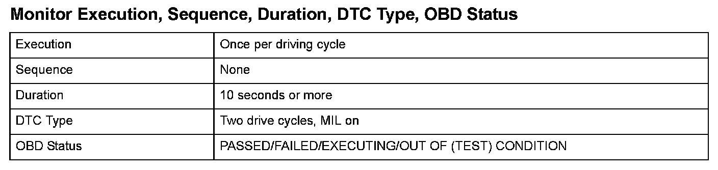 Monitor Execution, Sequence, Duration, DTC Type, OBD Status