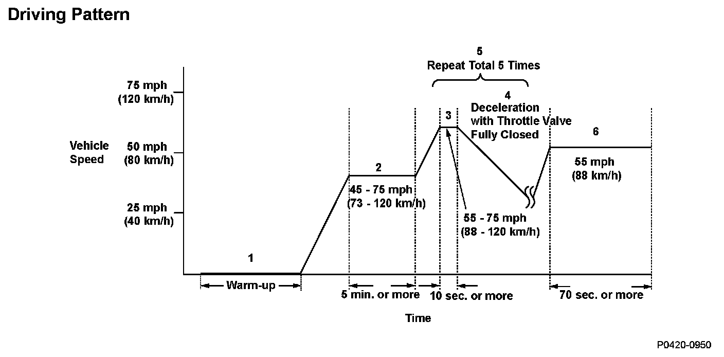 2. Drive the vehicle at a speed between 45 - 75 mph (73 - 120 km/h) for at least 5 minutes, to warm up the TWC.