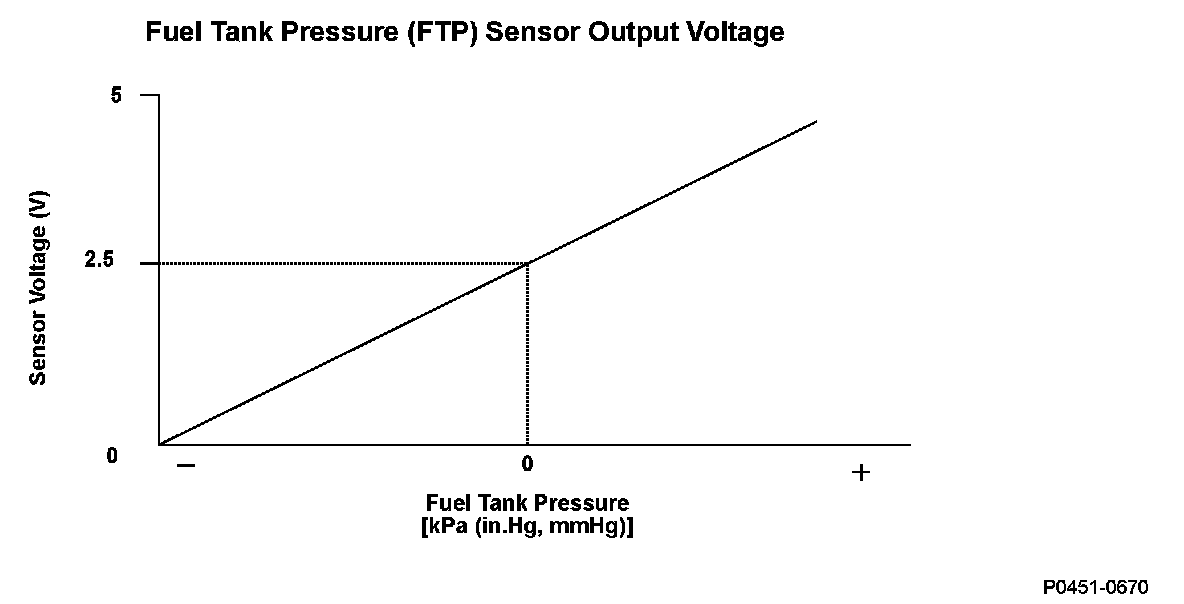 The fuel tank pressure (FTP) sensor is installed on the evaporative emission (EVAP) canister and detects the fuel tank pressure. The FTP sensor is used to detect leaks in the EVAP system. The powertrain control module (PCM) monitors the FTP sensor output voltage. The FTP sensor output voltage rises as the fuel tank pressure increases. Conversely, the FTP sensor output voltage drops as the fuel tank pressure decreases. If the FTP sensor output voltage does not reach a target value within a set time after starting the engine in a cold condition, the PCM detects a malfunction and stores a DTC.