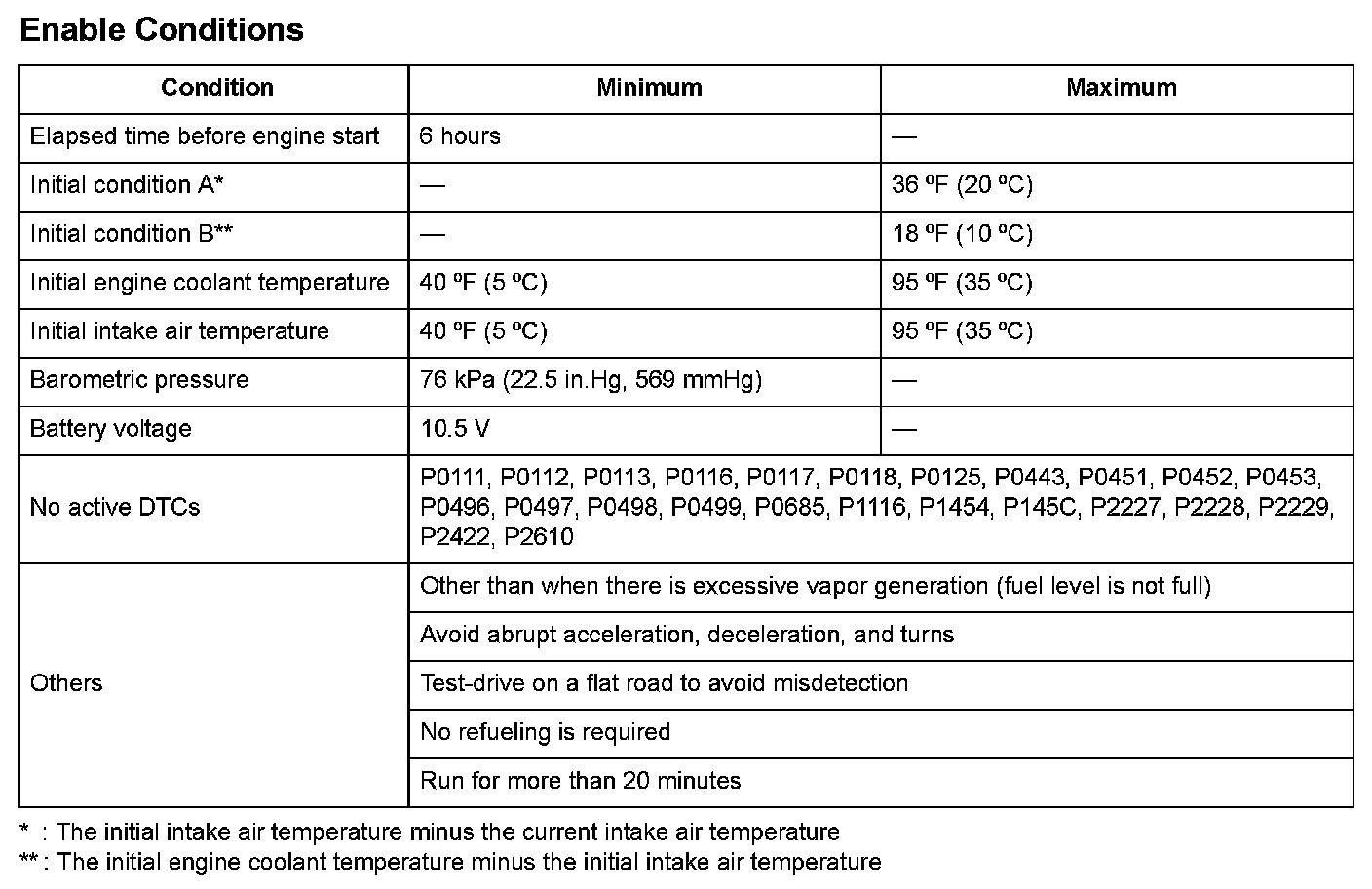 1. After the engine is off for a specified amount of time, and the engine coolant temperature and intake air temperature within the specified range, start the engine.