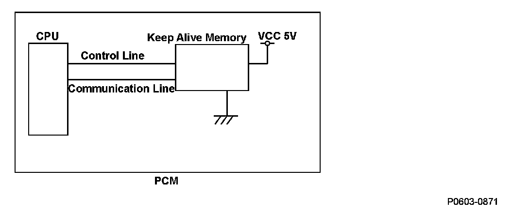 The powertrain control module (PCM) is equipped with a keep alive memory. The data (control learn data, etc.) for powertrain control and information (vehicle identification number (VIN), etc.) related to the vehicle control is stored in the keep alive memory, so that it can be maintained even when power is not supplied to the PCM, such as when the battery is disconnected. When power is restored to the PCM, the CPU retrieves the stored information from the keep alive memory, but when the data retrieval process is not finished normally, a malfunction is detected and a DTC is stored. The CPU writes data to the keep alive memory from the CPU: Control related data is written when the ignition switch is turned to ON (II) or the engine start/stop button is pressed to select the ON mode, and vehicle information when commanded from the HDS. If the data writing process is not completed normally, a malfunction is detected and a DTC is stored.