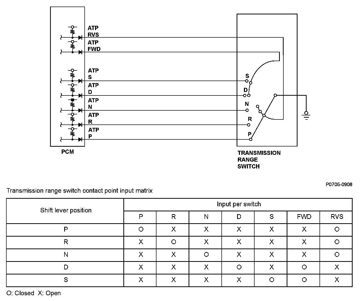 The transmission range switch is attached to a control shaft. Operating the shift lever makes the control shaft rotate via the shift cable. The A/T gear position indicator shows which position is selected according to the Low/High signal combinations, which vary based on the control shaft rotational angle. The control shaft changes the position of the transmission range switch, activates the manual valve, and switches hydraulic pressure to shift the transmission through forward/neutral/reverse. The transmission range switch signal is used to determine the shift schedule. The voltage is high (5V or 12 V) at them powertrain control module (PCM) input terminal when each transmission range switch position is open, and it is low (0 V) when each switch is closed. If the FWD switch stays open while the vehicle repeatedly accelerates to a specified vehicle speed and then stops, despite being in D, the PCM detects a malfunction in the transmission range switch (open) and stores a DTC.