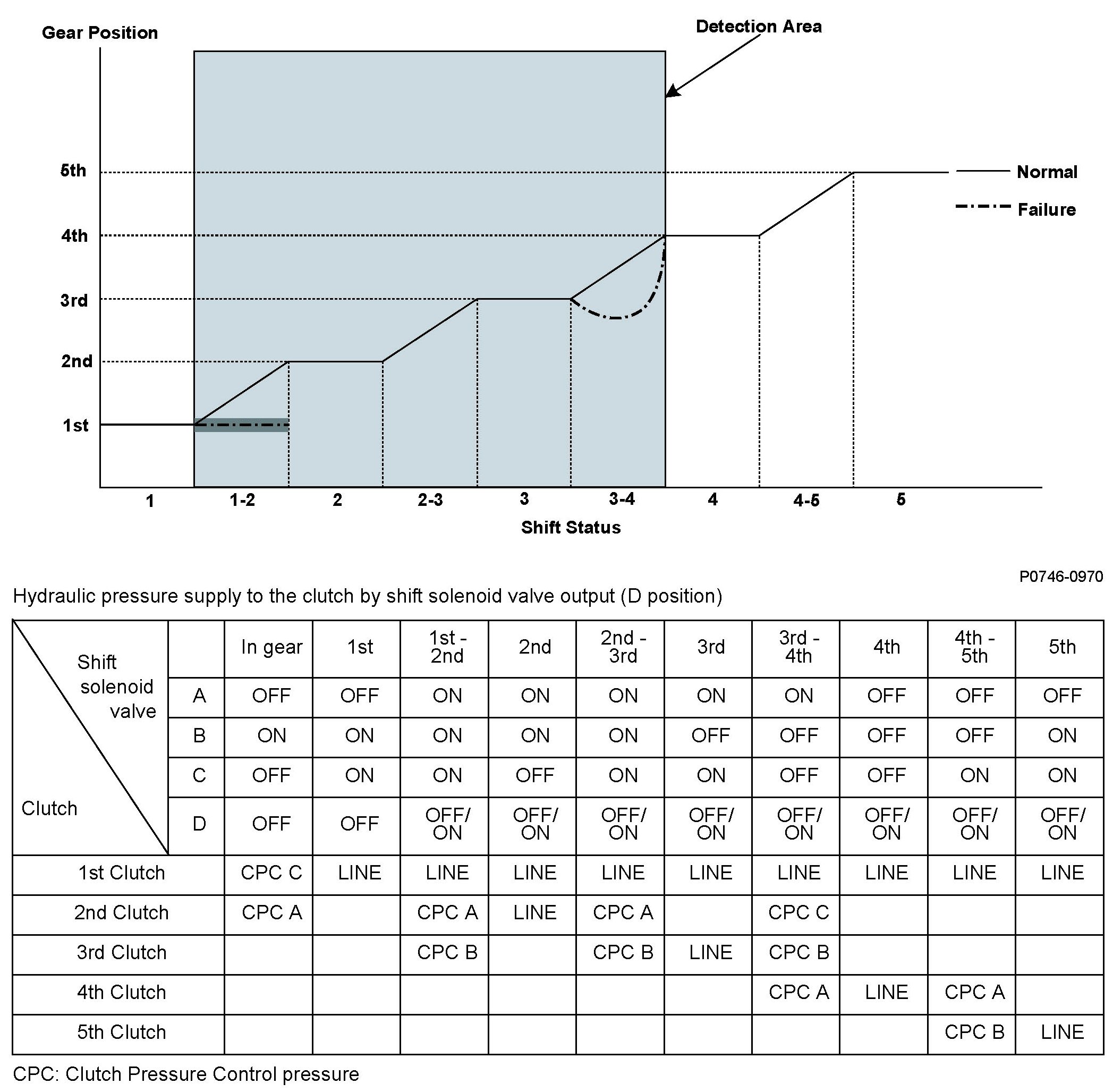 A/T clutch pressure control solenoid valve A is installed in the transmission housing. A/T clutch pressure control solenoid valve A is operated by the powertrain control module (PCM) and converts the modulated pressure to A/T clutch pressure control solenoid A pressure, which operates CPC valve A. Line pressure is modulated to clutch pressure control A pressure (CPC A pressure) by CPC valve A and the CPC valve A spring. A signal from the PCM is output to the proper gear clutch, determined by the gear schedule, to supply the proper CPC pressure according to the driving conditions. When the current from the PCM is high (ON), A/T clutch pressure control solenoid valve A operates and the CPC valve A pressure increases. When the current from the PCM is low (OFF), A/T clutch pressure control solenoid valve A turns off and CPC valve A pressure decreases. The PCM monitors the input shaft (mainshaft) speed and the output shaft (countershaft) speed at the gear change determined by the shift schedule. When an improper gear ratio is output compared to the predetermined gear ratio, an A/T clutch pressure control solenoid valve A OFF failure is detected and a DTC is stored.