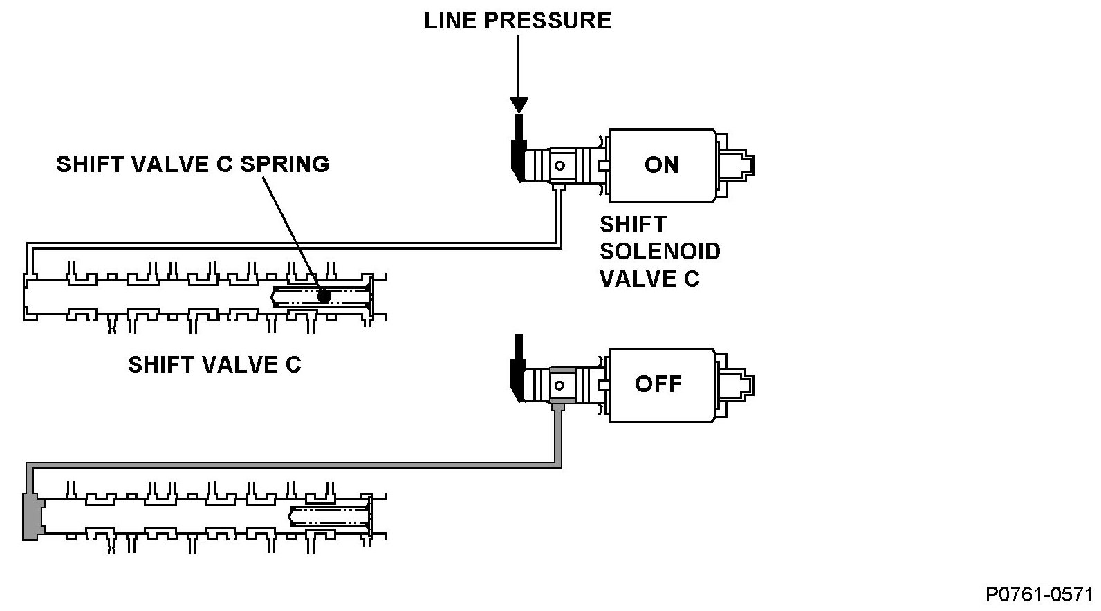 Shift solenoid valve C is installed in the transmission housing. It is controlled by the ON/OFF signal from the powertrain control module (PCM) to apply modulated pressure to shift valve C. The signal from the PCM is output to apply clutch pressure control pressure to the proper gear change clutch according to the gear change schedule. When the signal to shift solenoid valve C from the PCM is ON, and modulated pressure is discharged, shift valve C is inactive. When the signal to shift solenoid valve C from the PCM is OFF, and modulated pressure is applied to shift valve C, it operates against the shift valve C spring. The PCM monitors the input shaft (mainshaft) speed and the output shaft (countershaft) speed at the gear change determined by the shift schedule. When an improper gear ratio is output compared to the predetermined gear change mode, a shift solenoid valve C OFF failure is detected and a DTC is stored.
