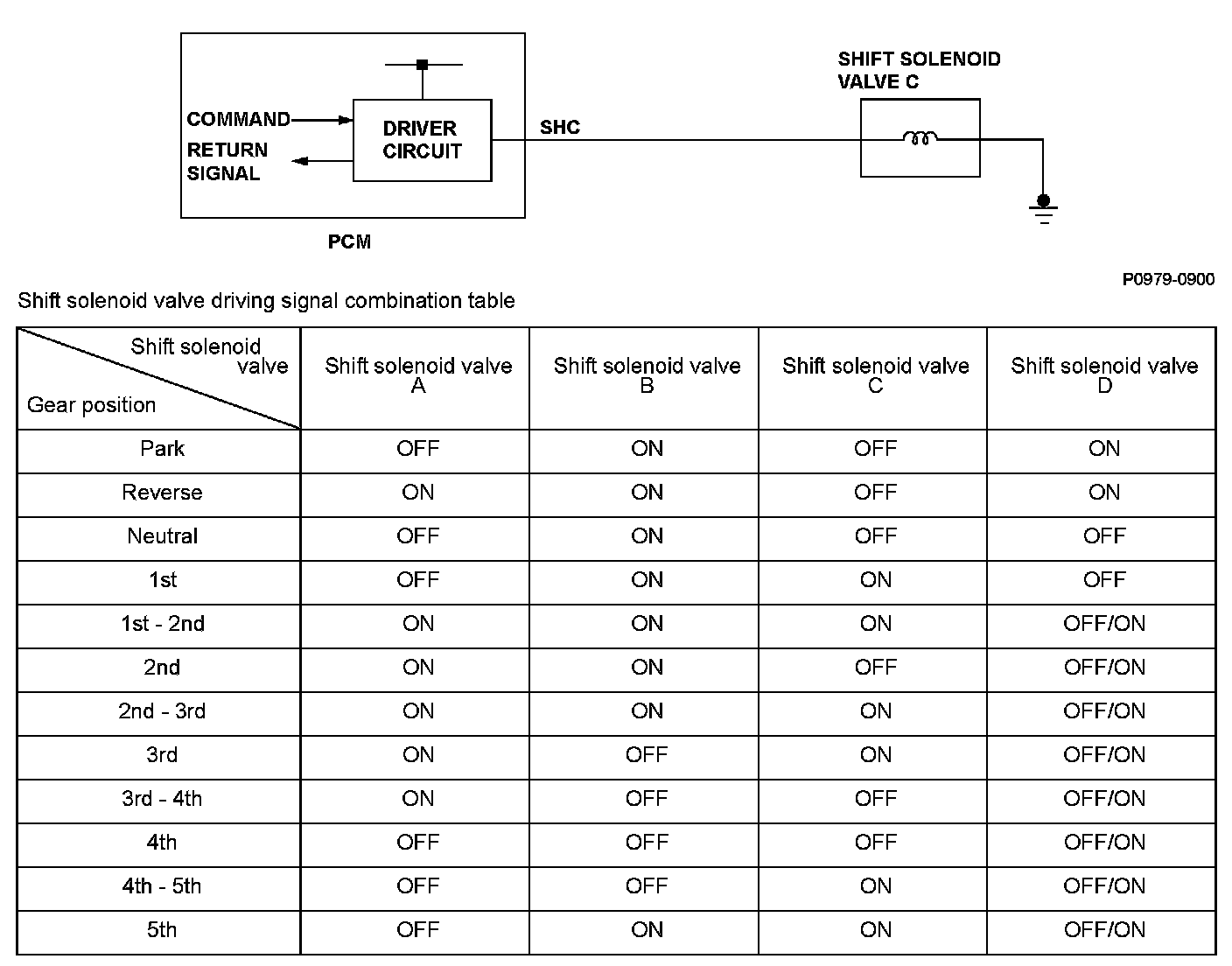 When shift solenoid valves A and D are turned ON, or when shift solenoid valves B and C are turned OFF, the hydraulic pressure circuit opens. The hydraulic pressure circuit supplies/discharges hydraulic pressure to/from each clutch according to the combination of the ON/OFF status of the shift solenoid valves. The powertrain control module (PCM) commands the driver circuit to turn on the shift solenoid valve. The circuit diagnosis malfunctions such as a circuit short or open, and sends back a return signal during the PCM's command. A malfunction is detected when the return signal does not match the PCM command to turn ON the shift solenoid valve, and a DTC is stored.