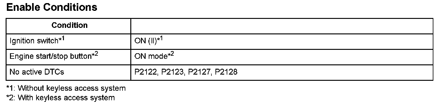 Accelerator pedal position (APP) sensor A and accelerator pedal position (APP) sensor B are potentiometers. They are installed on the accelerator pedal. When the accelerator pedal is pressed, the APP sensors A and B detect the accelerator opening value. The accelerator pedal opening value is converted to a signal in APP sensors A and B and transmitted to the powertrain control module (PCM) to compute the target position. The target position signal is then transmitted to the throttle actuator control module. APP sensor A is for the primary control, and APP sensor B is a back-up. Both sensors compare their output voltage to each other for malfunction detection. When the voltage difference of APP sensor B is out of a fixed range for a set time, the PCM detects a malfunction, and a DTC is stored.