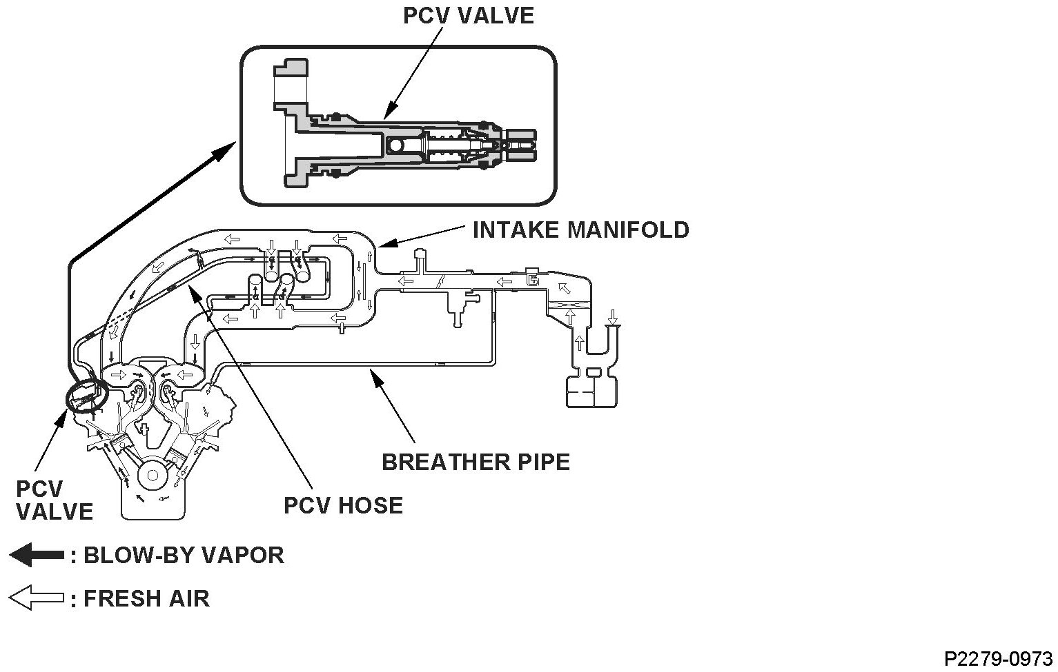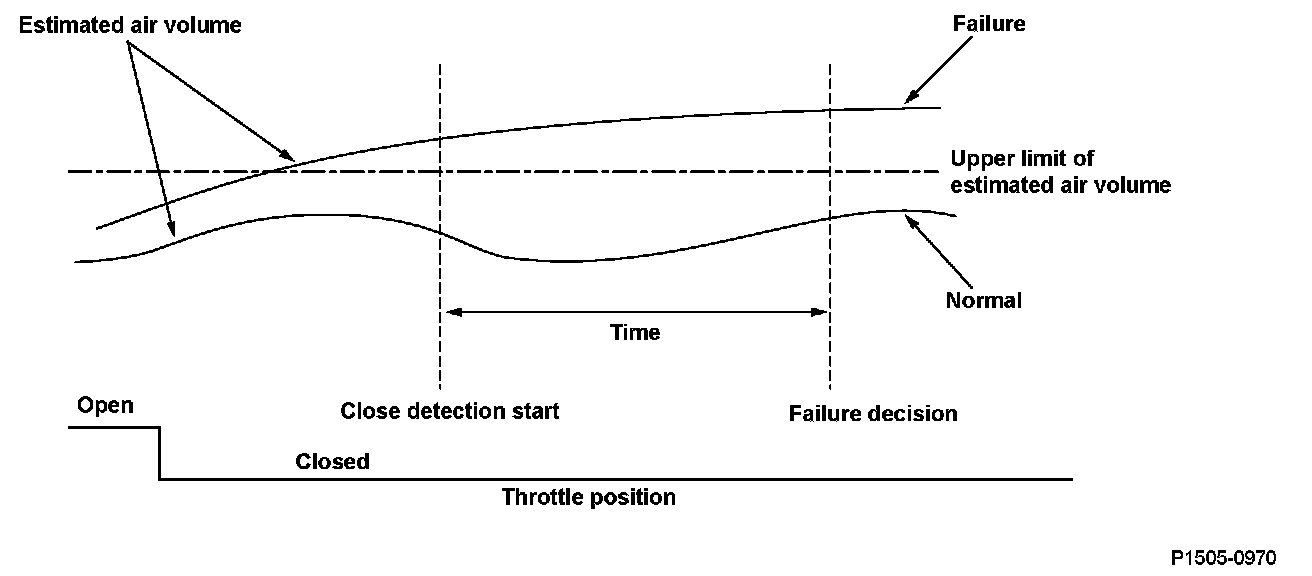The positive crankcase ventilation (PCV) system reduces hydrocarbon (HC) emissions. The PCV system recirculates unburned air/fuel mixture (blow-by vapor) into the intake manifold so that it can be drawn into the engine and burned, reducing HC. If the PCV hose comes off while air is supplied mainly via the idle control system with the throttle closed, the amount of air supplied to the engine is considerably more than the amount of air the idle control system supplies. The powertrain control module (PCM) estimates the amount of air supplied to the engine while the throttle valve is fully closed, and if the estimated amount is more than the upper limit, it detects a malfunction and a DTC is stored.