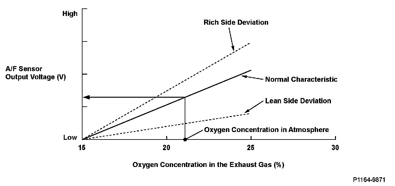 Note: Output to the scan tool exhibits a relationship between the rear A/F sensor output and oxygen concentration, which is opposite to the characteristic shown in the graph. That is, a deviation toward the rich side increases the output voltage and one toward the lean side decreases the output voltage, as the stoichiometric ratio is 0.