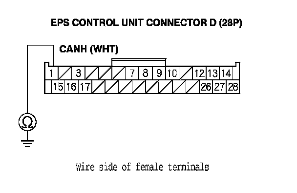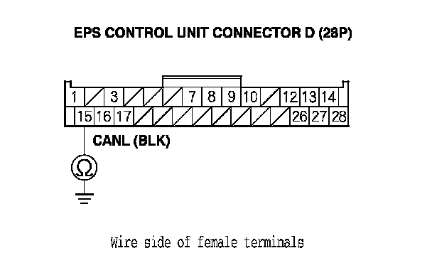 13. Check for continuity between EPS control unit connector D (28P) terminal No. 15 and body ground.