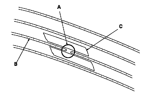 2. Carefully mask above and below the broken portion of the window antenna wire (B) with cellophane tape (C).