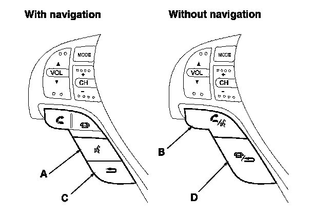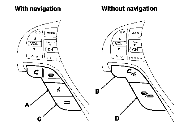 To go back a step in a voice command sequence, press and release the BACK button (C) or the HFL BACK button (D), or press the TALK button or the HFL TALK button and say "Go back." If you don't say anything while the HFL system is listening for your voice command, it times out and stops voice recognition. The next time you press and release the TALK button or the HFL TALK button, the HFL system begins listening from the point it timed out.