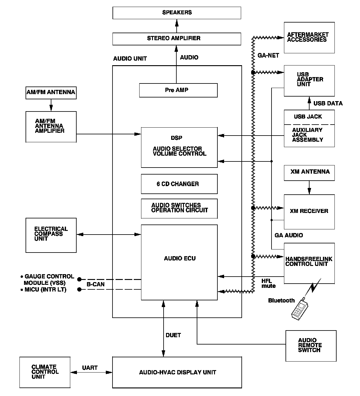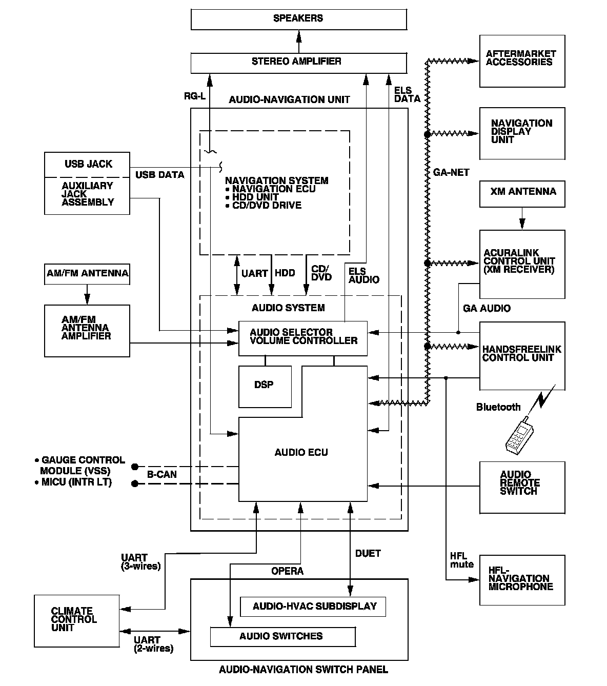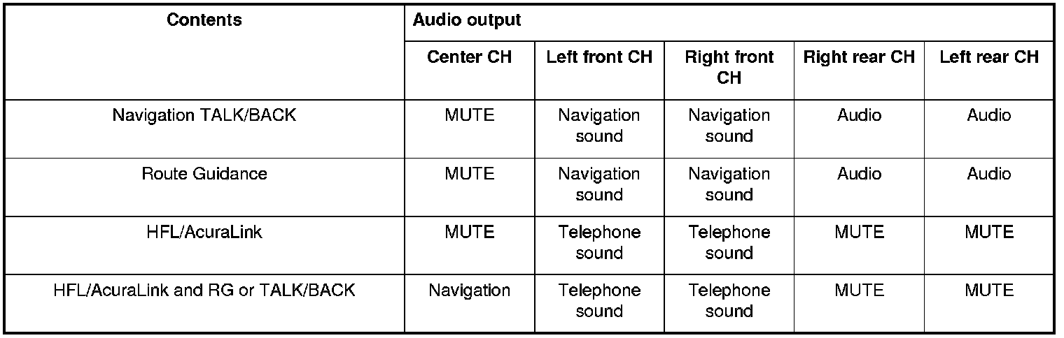 The optional navigation system provides voice control for the audio, the XM, and the CD player. Voice control commands are communicated through the GA-Net (audio unit). When using the TALK/BACK buttons or route guidance (RG), the center speaker is muted and you hear the navigation instructions through the front speakers. When using the HFL/AcuraLink, the center speaker, the rear speakers, and the subwoofer are muted and the front speakers give the telephone sound. When using the HFL/AcuraLink and the RG (Route Guidance) or the TALK/BACK buttons, the rear speakers are muted and you hear the telephone sound and navigation instructions through the front speakers. Muting commands are passed on the GA-Net bus. For more information, see the navigation section. The outline of the audio interruption function is shown in the following table.