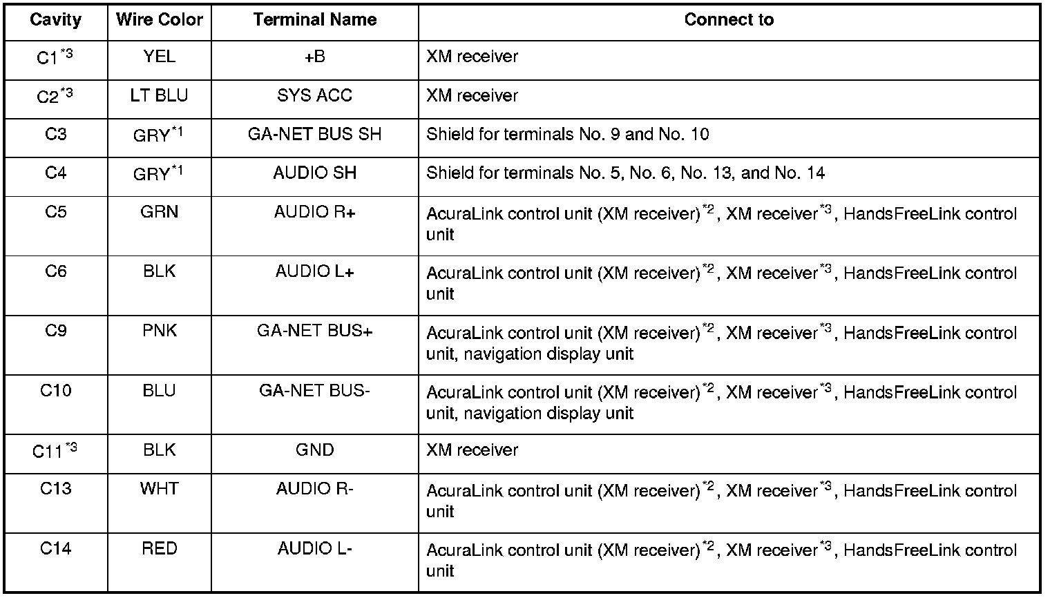 XM Receiver Connector for Inputs and Outputs (Without AcuraLink)