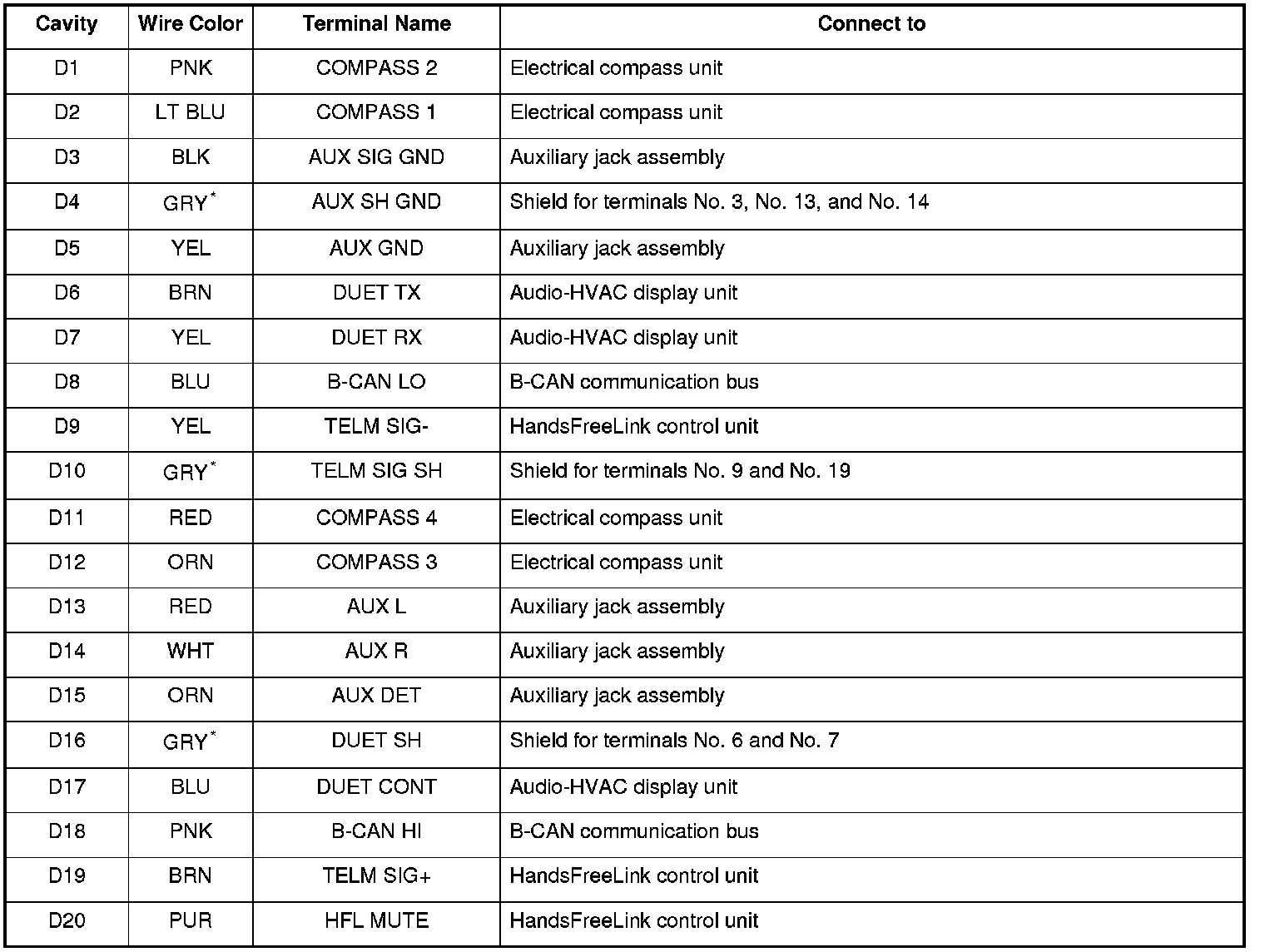 *: The shielded wires have a heat-shrunk tube insulating the outside of the wire. The color of the insulating tube, typically black or dark gray, may not match the color of the wire listed on the schematic.