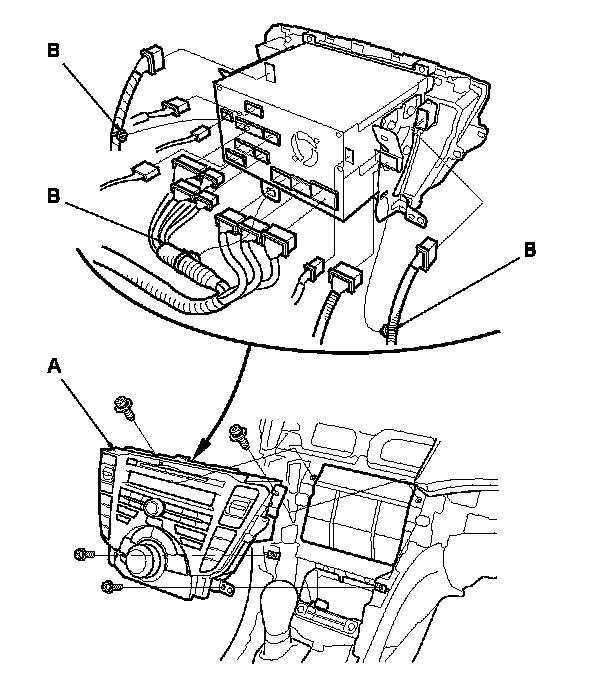 5. Disconnect the connectors, and detach the clips (B).