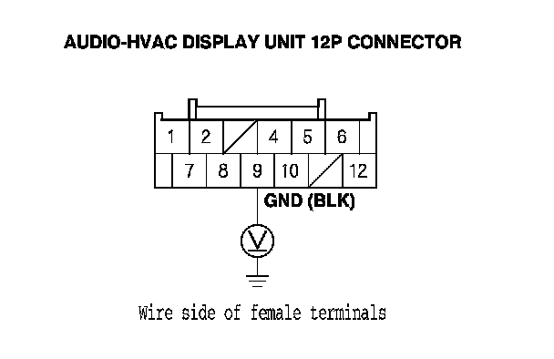 6. Measure the voltage between audio-HVAC display unit 12P connector terminal No. 9 and body ground.