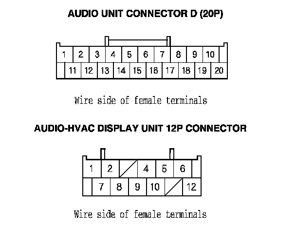 2. Check the connections at the audio-HVAC display unit 12P connector and audio unit connector D (20P).